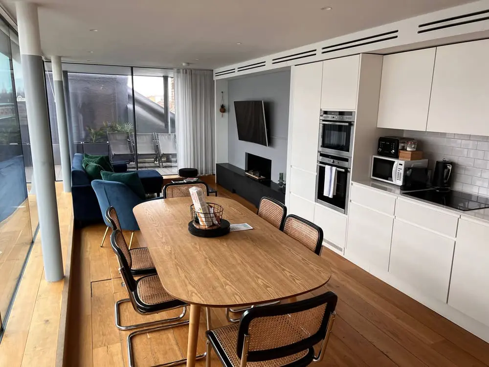 The entrance is nice and inviting with some umbrellas you can borrow should it be a typical rainy day in London. Once you step into your flat, there’s fun art on the walls and a comfy sofa and armchair to relax in front of your Smart TV.